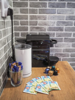 Dodatkowo w mieszkaniu znajduje się duża kuchnia z lodówką z zamrażalnikiem, kuchenką elektryczną, czajnikiem, ekspresem do kawy, talerzami, szklankami oraz wszystkimi niezbędnymi przyborami do gotowania.