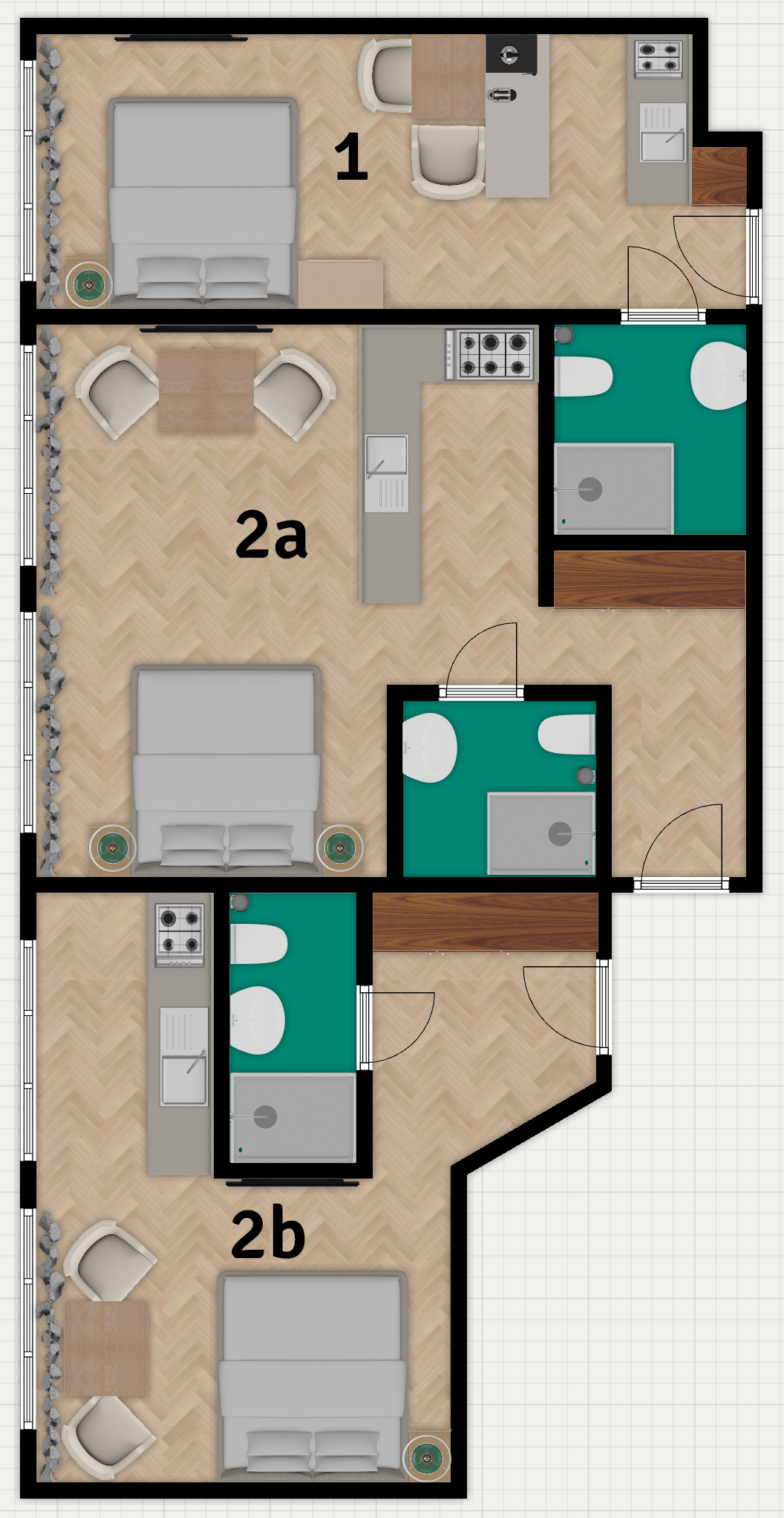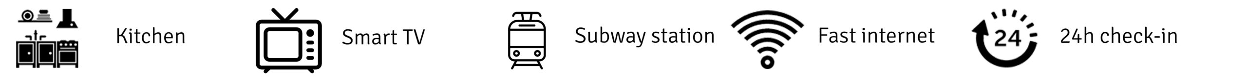 All of the units are designed in the same style and have a fully equipped kitchenette, dining space, large bathroom, large bed (180×200) and at least 40” Smart TV. Smart TV’s let You log in with any of Your accounts and use streaming services, they are also equipped with built in Chromecast, so You can easily use them to watch Your favourite shows without logging in, too.