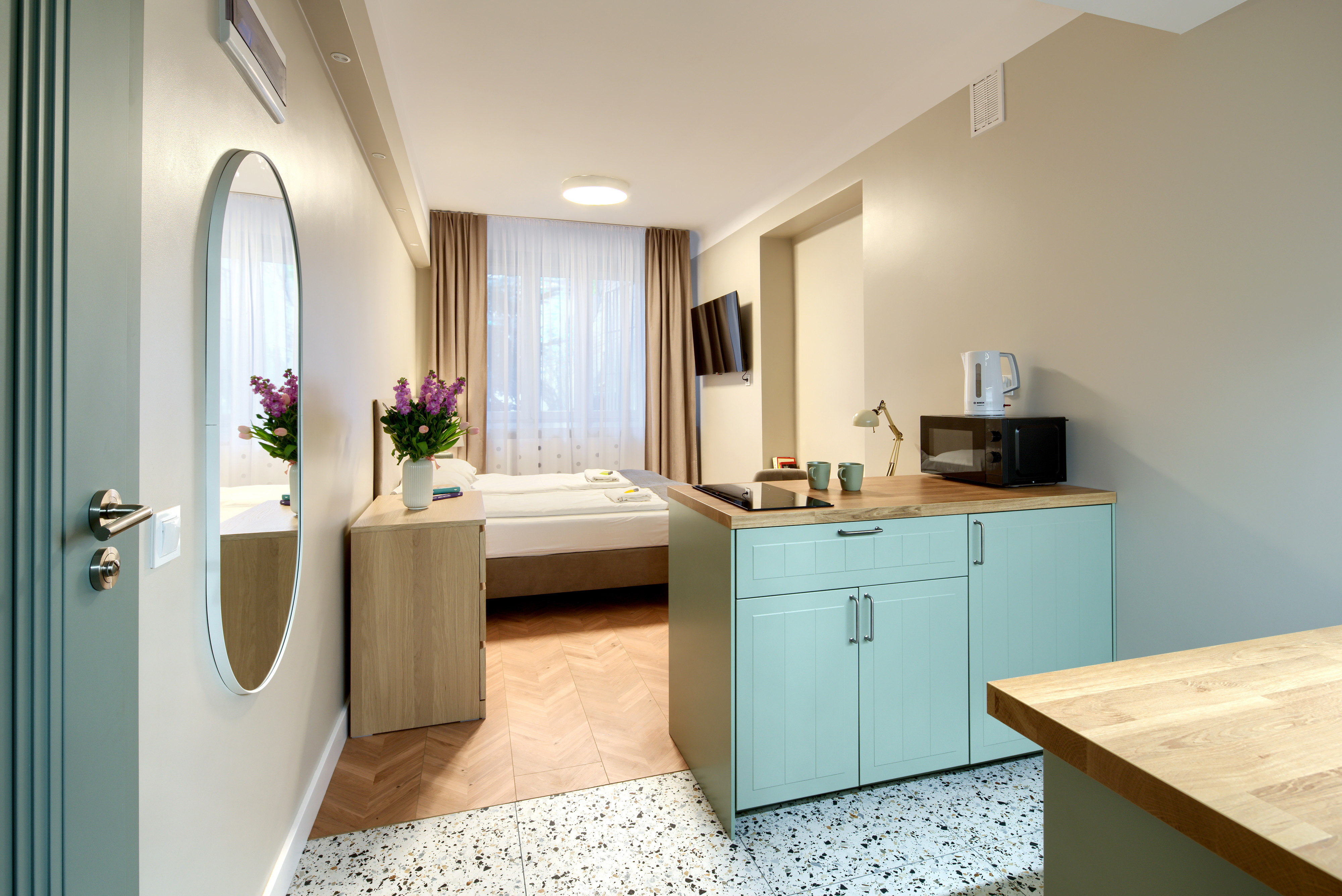 Despite being compact, units feel spacious thanks to a very high ceiling (3m) and well planned space that is not overcrowded. Apartments are designed in elegant and minimalistic style, dominating colours are beige and muted green. The design resembles the design of hotel rooms. These apartments were fully renovated in 2023.