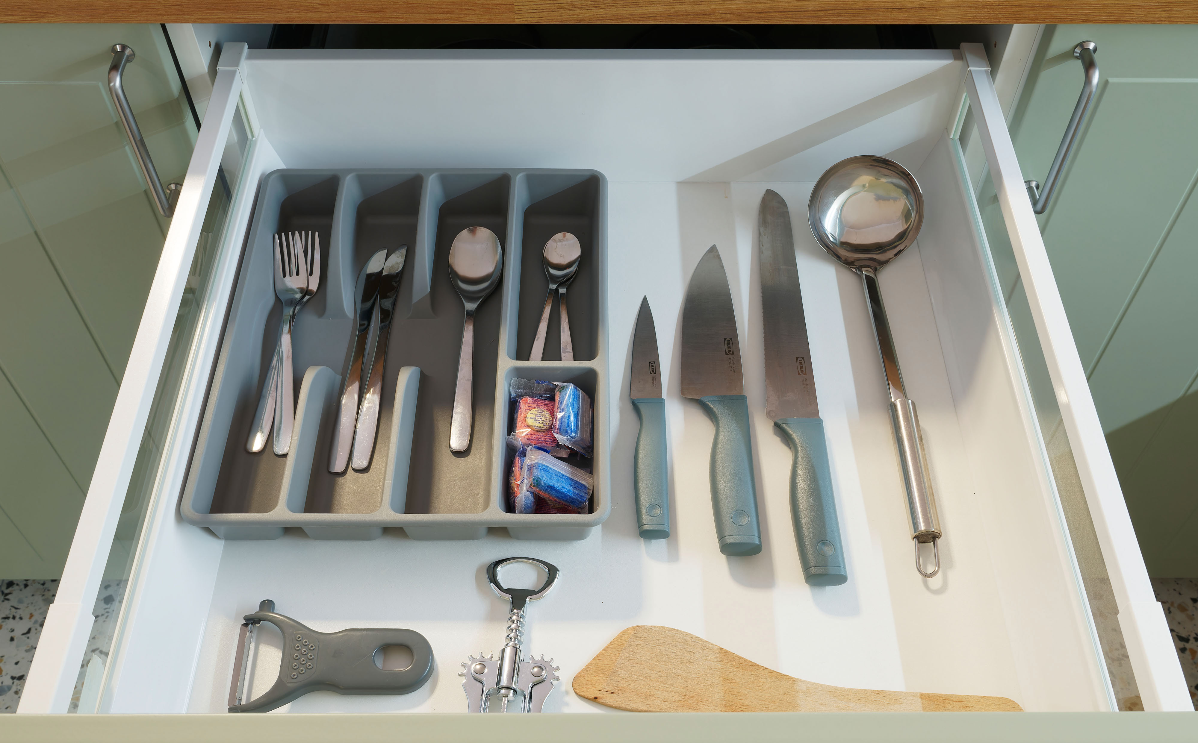 - Kitchen utensils, dishes, cuttlery