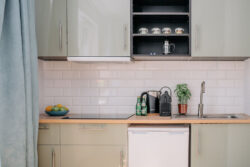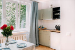 W apartamencie znajduje się oddzielna część kuchenno jadalna. W której znajduje się aneks kuchenny oraz część jadalna dla 4 osób.