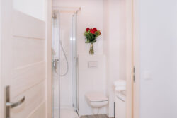 W łazience wykończonej kafelkami znajduje się wygodny prysznic(80×80), toaleta oraz umywalka z lustrem.