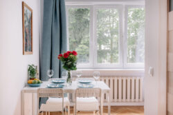 Dla osób podróżujących służbowo atutem jest duże biurko do pracy z komputerem i wygodny skórzany fotel biurowy. W apartamencie na wynajem dostępny jest szybki internet bezprzewodowy.