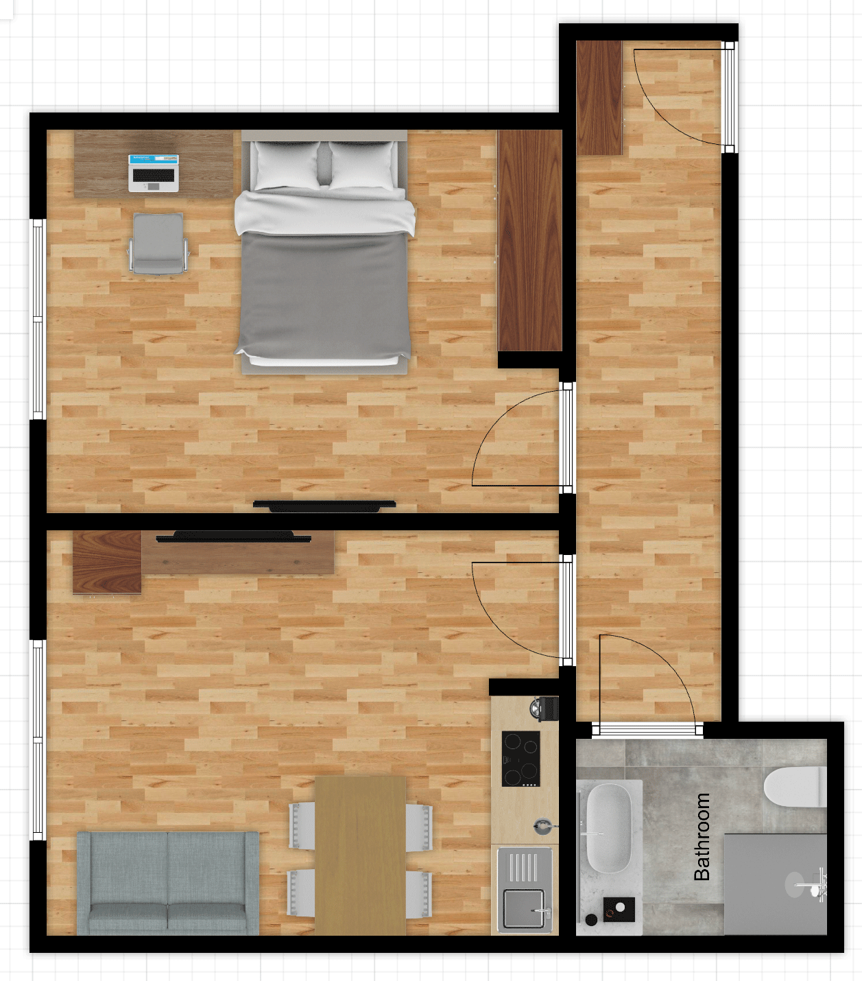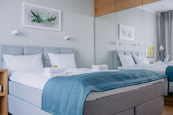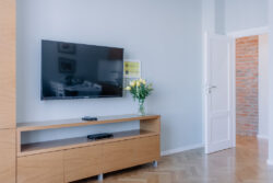 Mieszkanie składa się z dwóch pokoi, dużej łazienki oraz korytarza. Jeden z pokoi pełni funkcję sypialni i wyposażony jest w bardzo wygodne łózko kontynentalne (160×200), miejsce do pracy, szafę oraz TV. Drugi pokój wyposażony w rozkładaną sofę, duży stół, TV oraz aneks kuchenny, może służyć jako druga sypialnia lub jako miejsce spotkań np. mała sala konferencyjna. Możliwe jest podpięcie komputera do dużego 50″ TV.