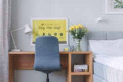 APARTEL Plac Unii Lubelskiej to dwupokojowy apartament o powierzchni 48m2, przeznaczony na wynajem krótkoterminowy. Apartament położony jest na 4 piętrze przedwojennej kamienicy. Wykończony został w klasycznym i minimalistycznym stylu. Meble i podłoga są wykonane z jasnego drewna, a ściany pomalowano na kolor szary, całości dopełniają białe dodatki oraz ręcznie malowane obrazy.