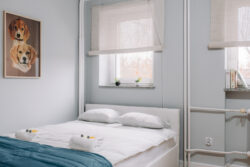 Apartament może zapewnić nocleg maksymalnie 4 osobom dorosłym i 1 dziecku do lat 3. Wyposażony jest w duże łóżko (160×200), rozkładaną kanapę (140×200) oraz łóżeczko turystyczne z materacem.