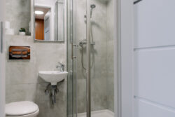 W łazience wykończonej szarymi płytkami znajduje się duży prysznic (80×120), toaleta oraz umywalka z lustrem.