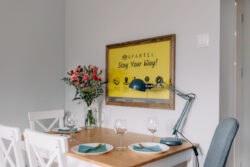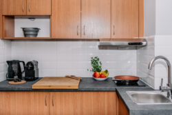 W pełni wyposażony aneks kuchenny pozwala poczuć się jak w domu i oszczędzić na wydatkach na restauracje. Przyjemnym dodatkiem jest ekspres kapsułkowy i kawa. W apartamencie jest również stół który może służyć jako miejsce do jedzenia posiłków dla 4 osób lub jako wygodne miejsce do pracy, jedno z krzeseł zostało zastąpione fotelem biurowym.